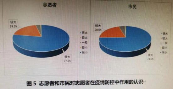 去年的疫情防控,志愿者积极投身到各类疫情防控志愿服务活动中,在社区、机场、道口及火车站值班值守、大力宣传抗疫科普知识、关爱居家隔离人员、为广大市民提供线上线下心理疏导等服务。数据显示,有96.5%的志愿者和95%的市民高度肯定志愿者在疫情防控中发挥的重要作用,其中,有77.3%的志愿者和74.5%的市民认为志愿者在疫情防控中的作用很大。
