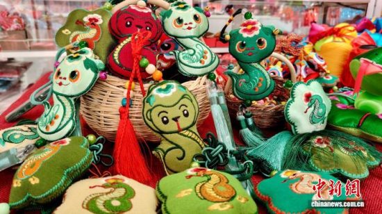 1月17日,甘肃庆阳市,绣娘们制作的蛇元素新春香包。盘小美 摄