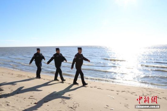 黑龙江出入境边防检查总站鸡西边境管理支队移民管理警察在兴凯湖湖畔巡逻。 李敬宇 摄