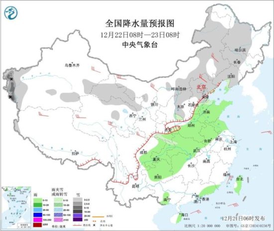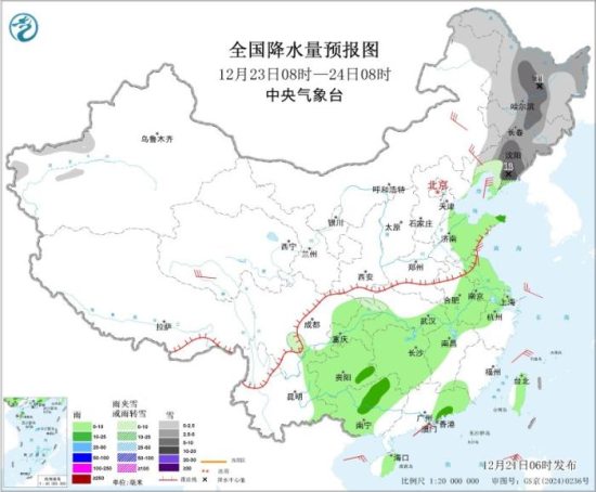 图4 全国降水量预报图(12月23日08时-24日08时)图片来源:中央气象台网站 中新网12月21日电